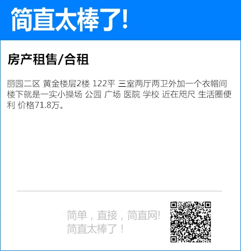 丽园二区 黄金楼层2楼 122平 三室两厅两卫外加一个衣帽间 楼下就是一实小操场 公园 广场 医院 学校 近在咫尺 生活圈便利 价格71.8万。