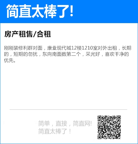 刚刚装修利群对面,康业现代城12楼1210室对外出租,长期的,短期的勿扰,东向南面数第二个,采光好,喜欢干净的优先。