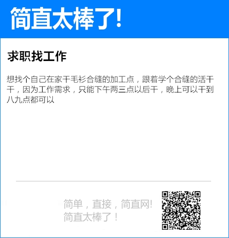 想找个自己在家干毛衫合缝的加工点,跟着学个合缝的活干干,因为工作需求,只能下午两三点以后干,晚上可以干到八九点都可以