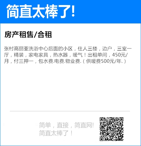 张村高丽亚洗浴中心后面的小区,住人三楼,边户,三室一厅,精装,家电家具,热水器,暖气!出租单间,450元/月,付三押一,包水费.电费.物业费.(供暖费500元/年.)