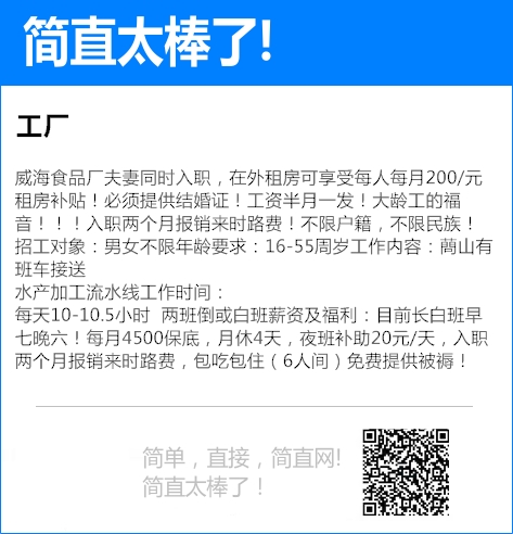 威海食品厂夫妻同时入职,在外租房可享受每人每月200/元租房补贴!必须提供结婚证!工资半月一发!大龄工的福音!!!入职两个月报销来时路费!不限户籍,不限民族!