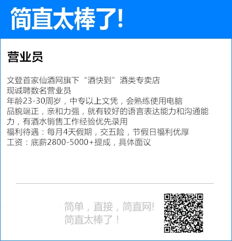 品貌端正,亲和力强,就有较好的语言表达能力和沟通能力,有酒水销售工作经验优先录用