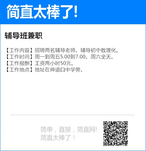 招聘一名本科大学理科毕业生或者大学生,能辅导初中9年级数理化,能讲明白题,解题思路清晰。一天5~6个小时。